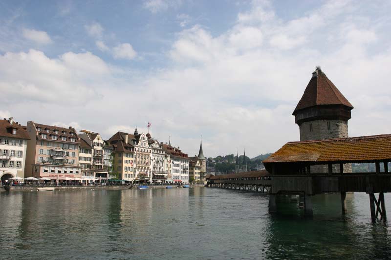 中央に敵の侵入を監視する塔を備えるカペル橋という木橋。14世紀に建造されたオリジナルは、1993年に